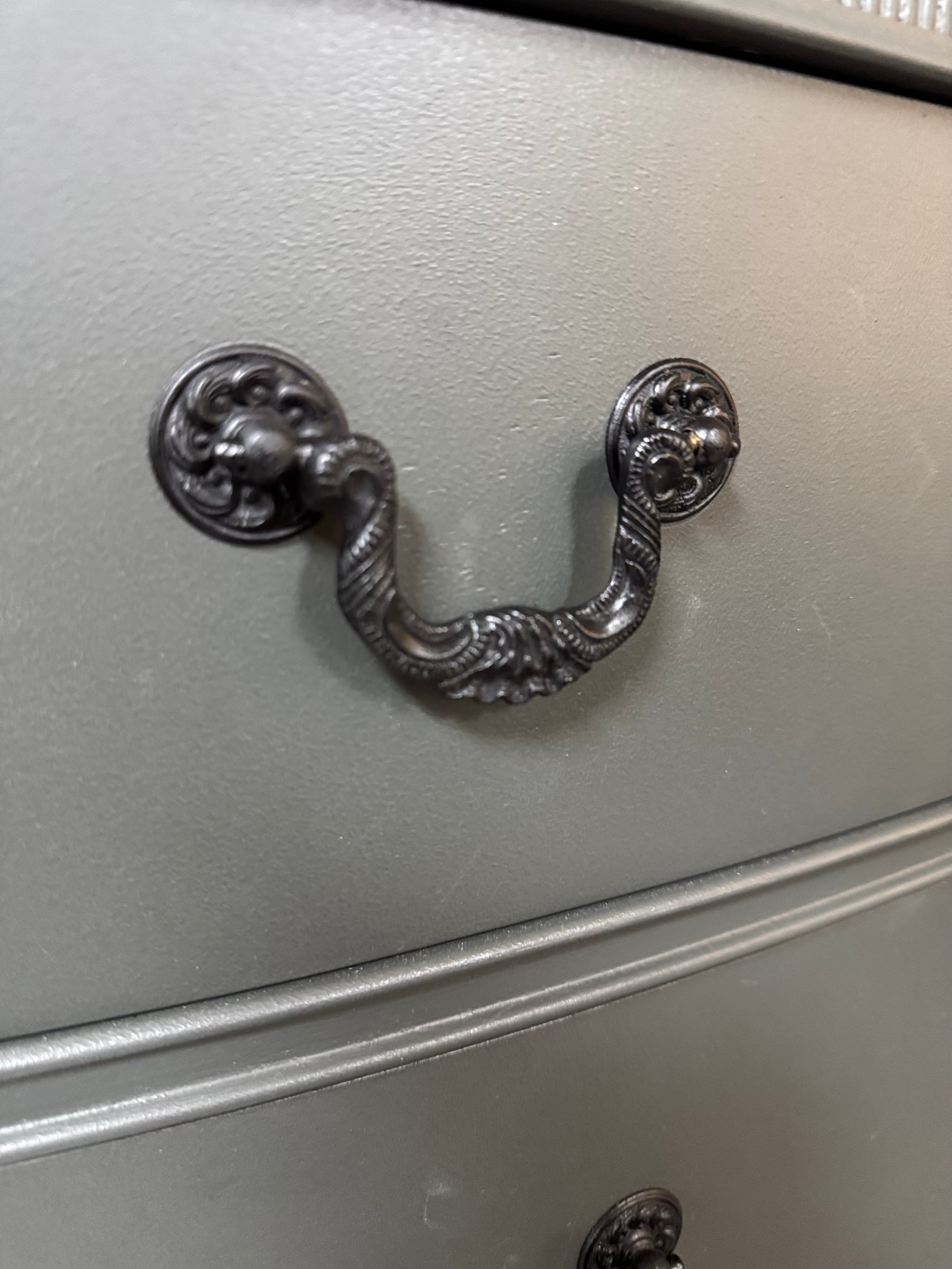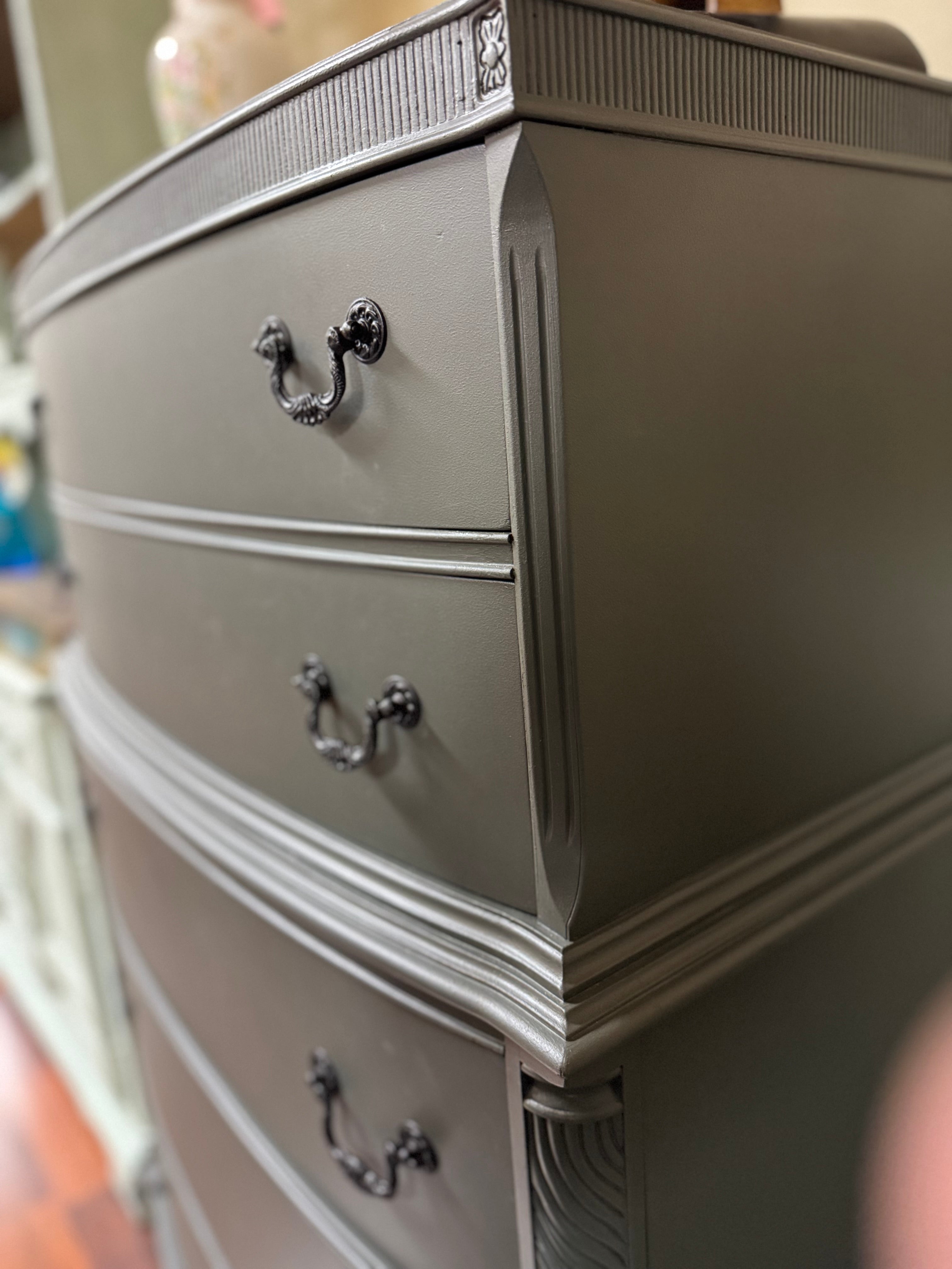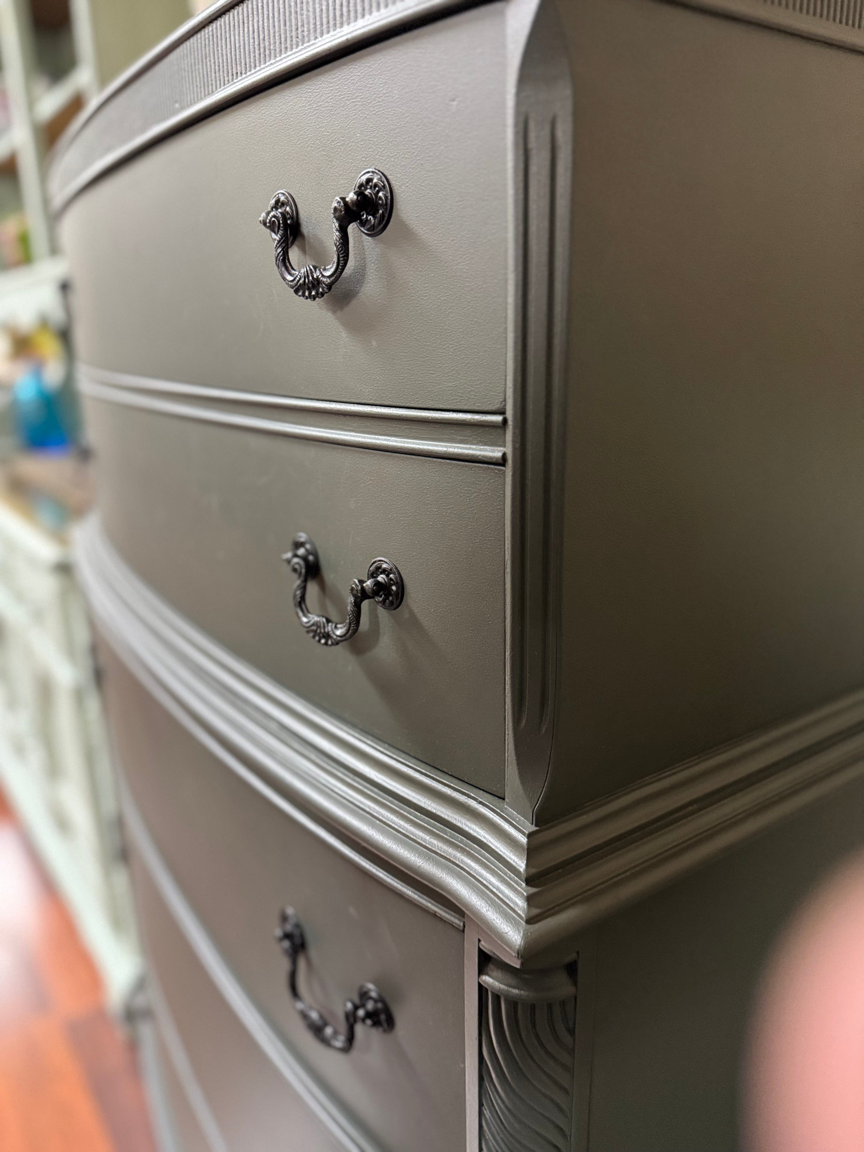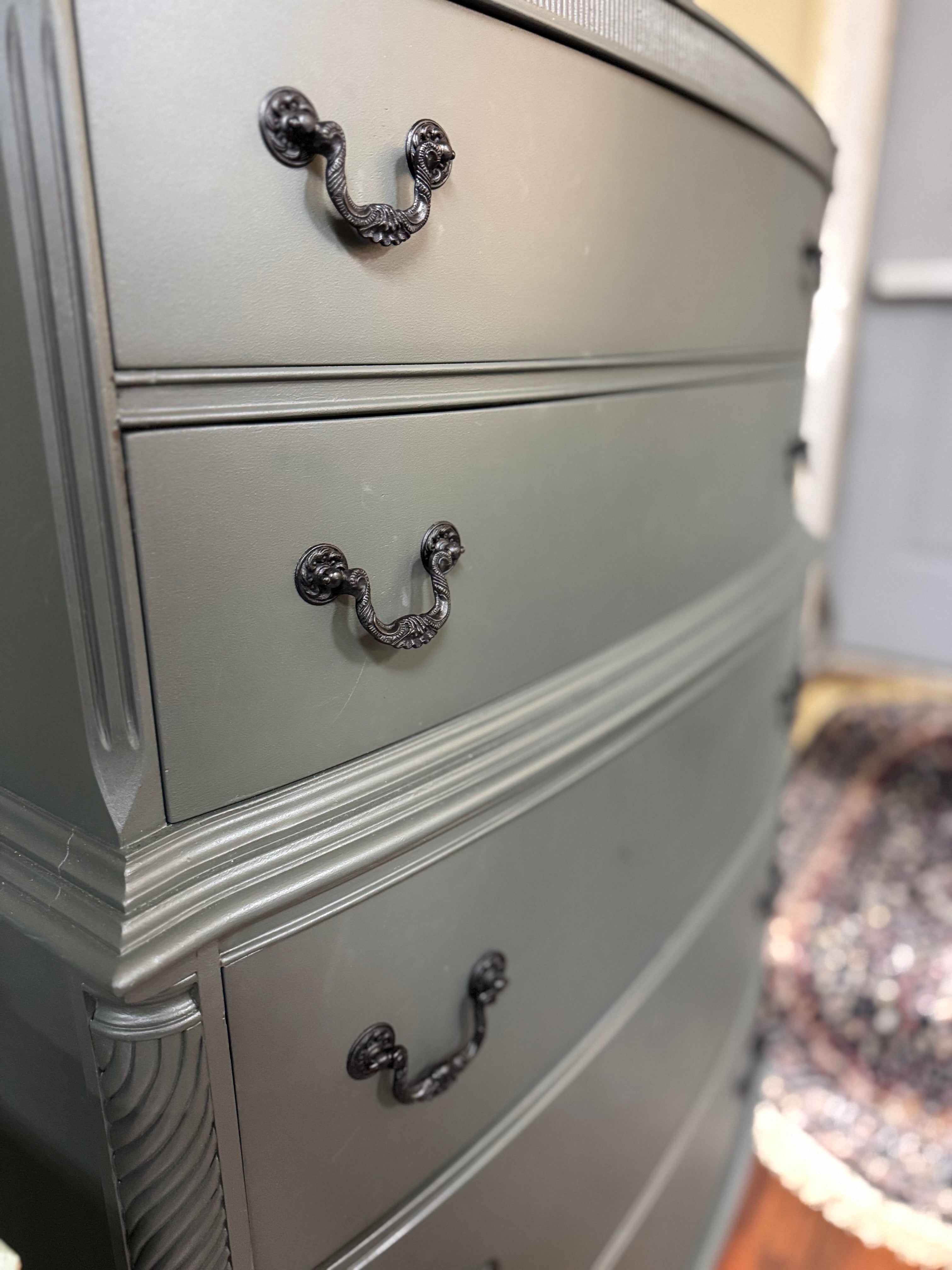 This vintage dresser is in great shape. It’s been painted with Fusion Wellington. The drawer pulls have all been painted in farmhouse black and the interior drawers have all been refreshed with wise owl salve. All of the drawers work well. Deliver available for an additional cost. This piece is currently available at Sentimental Journey in Johnson City TN.
