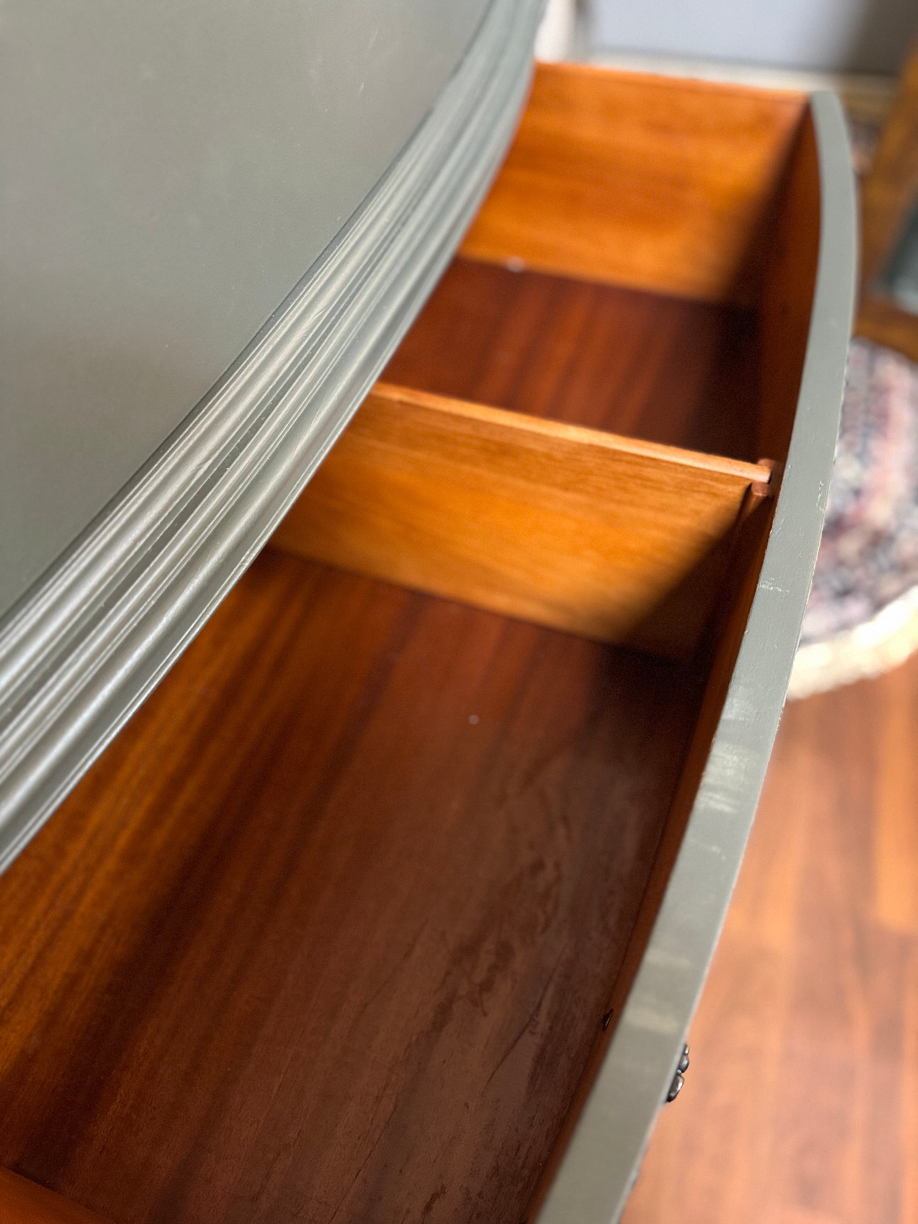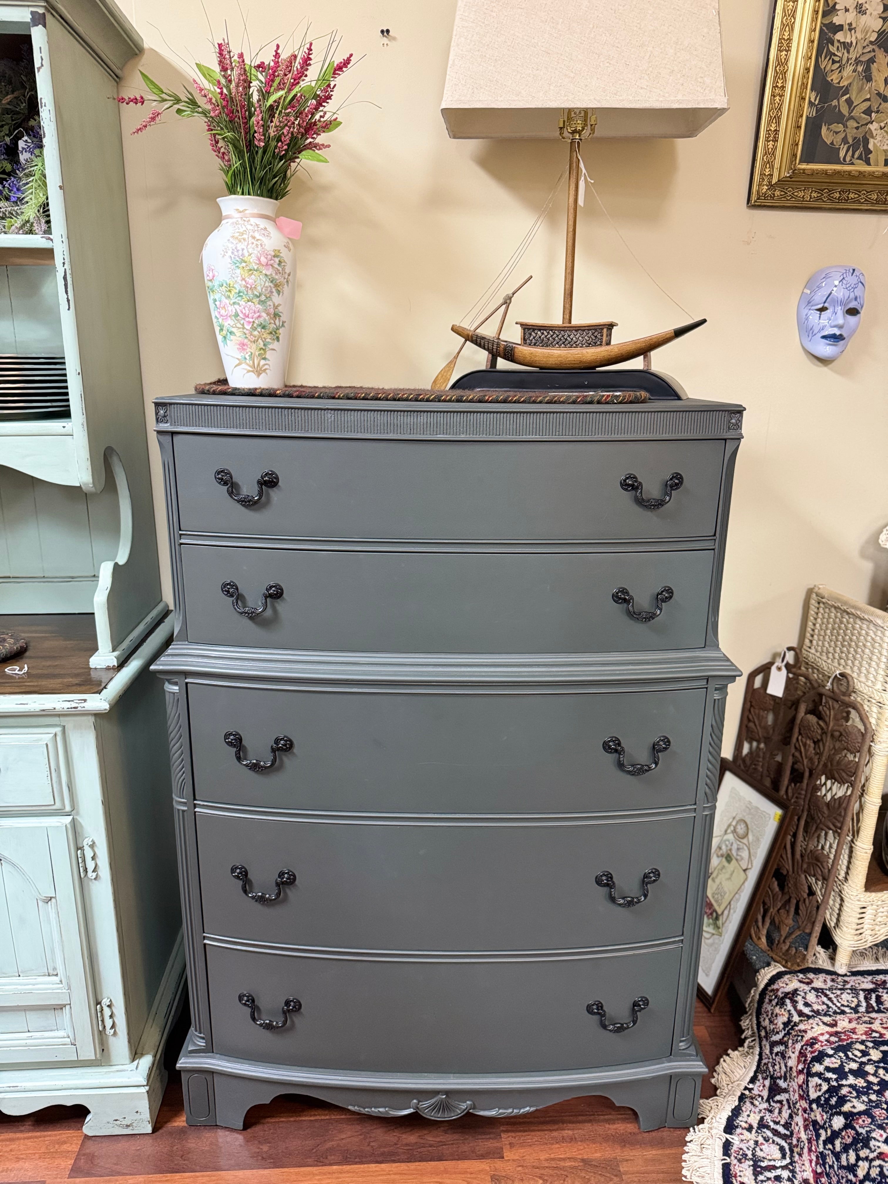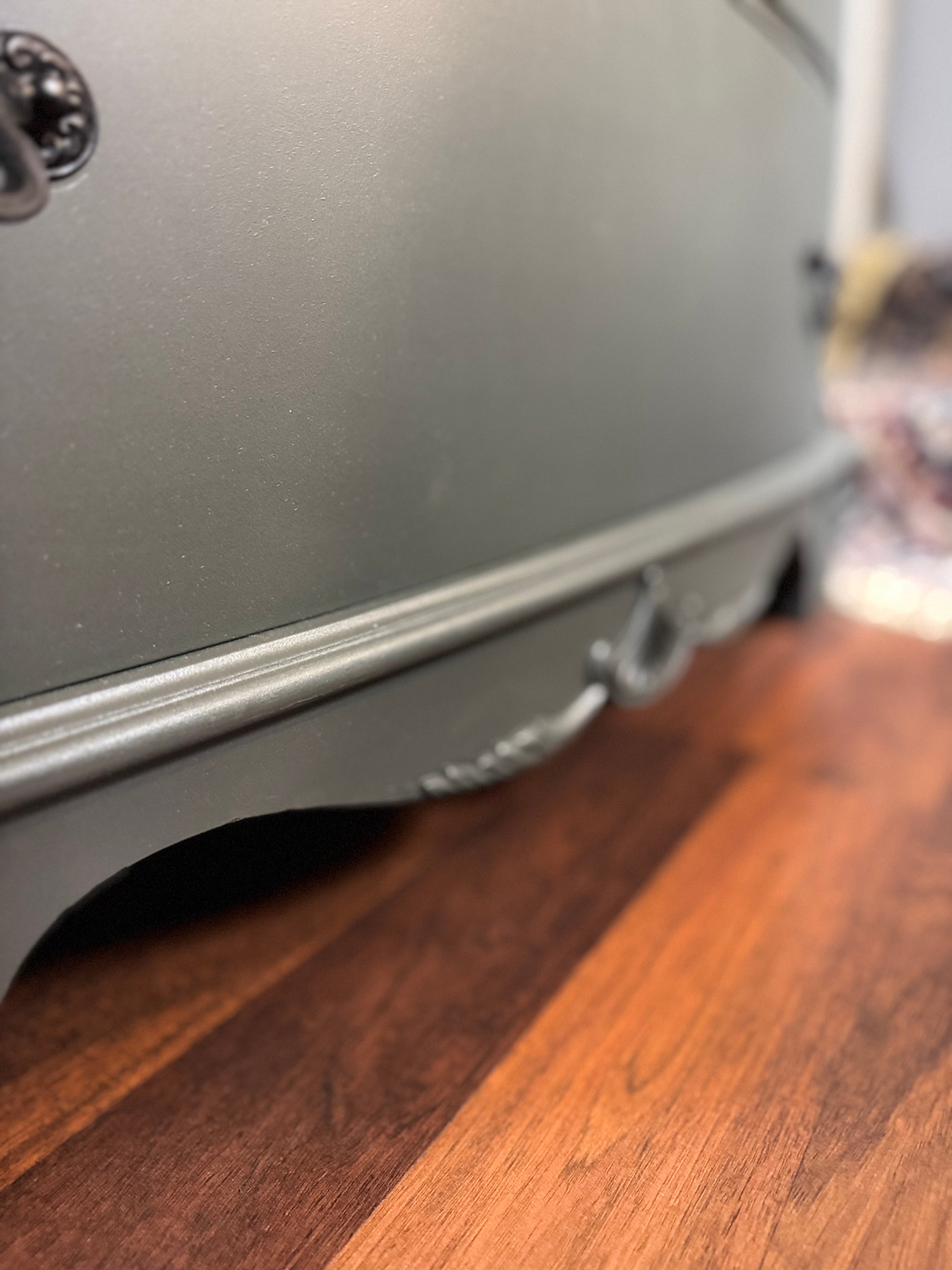 This vintage dresser is in great shape. It’s been painted with Fusion Wellington. The drawer pulls have all been painted in farmhouse black and the interior drawers have all been refreshed with wise owl salve. All of the drawers work well. Deliver available for an additional cost. This piece is currently available at Sentimental Journey in Johnson City TN.