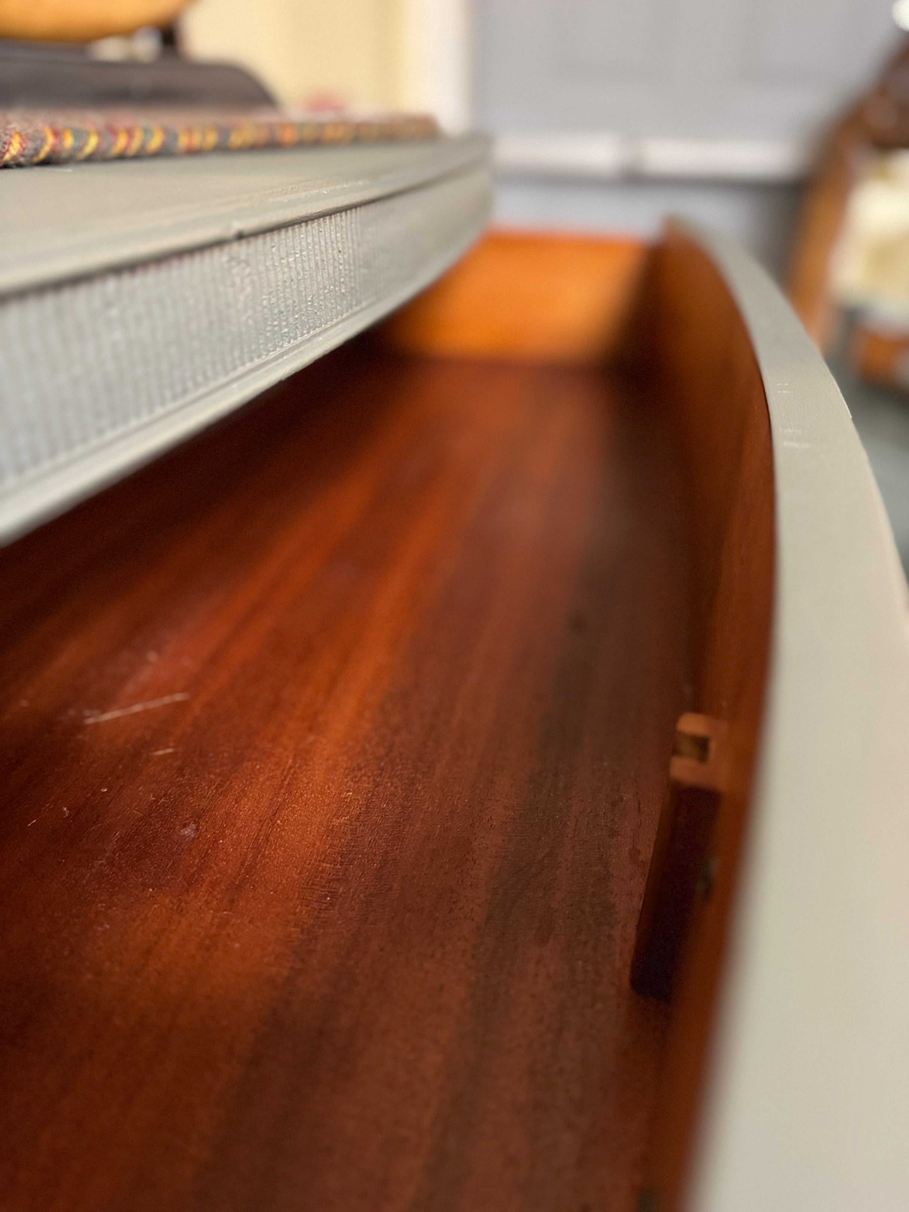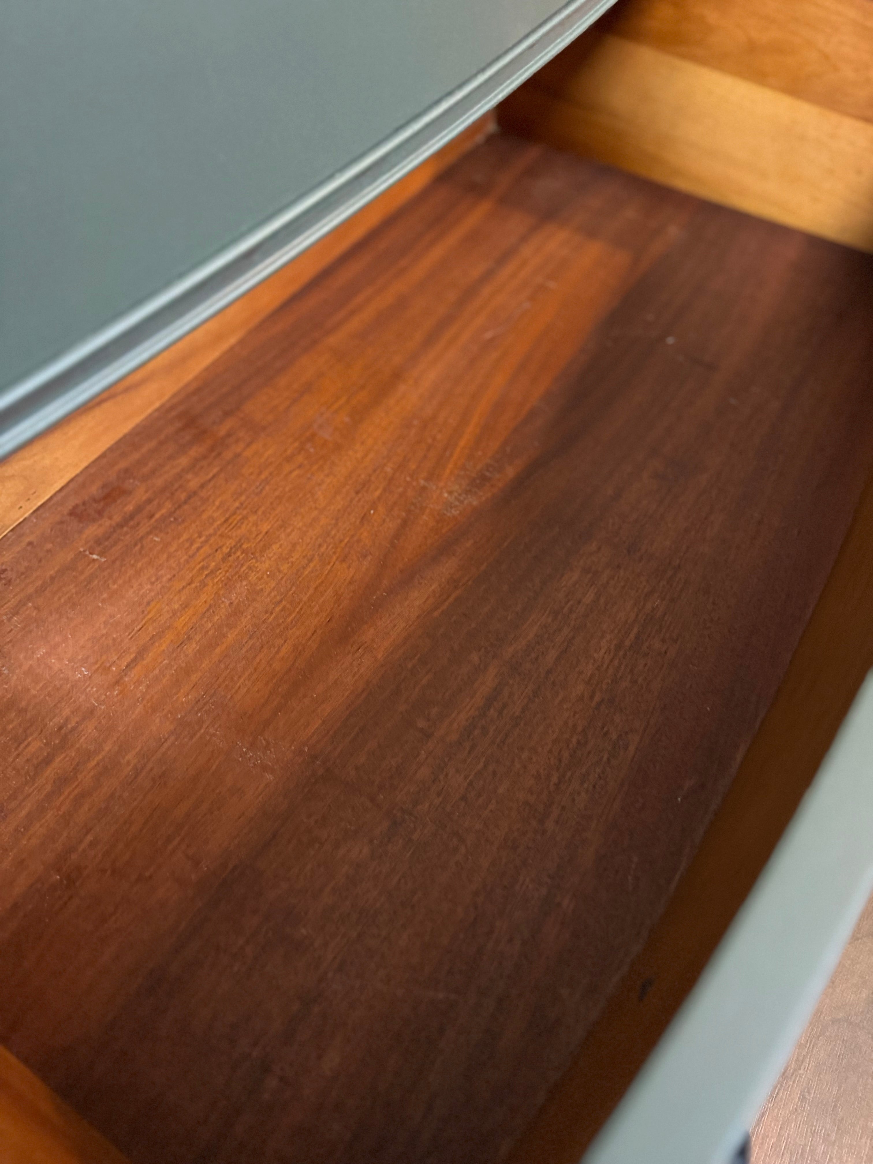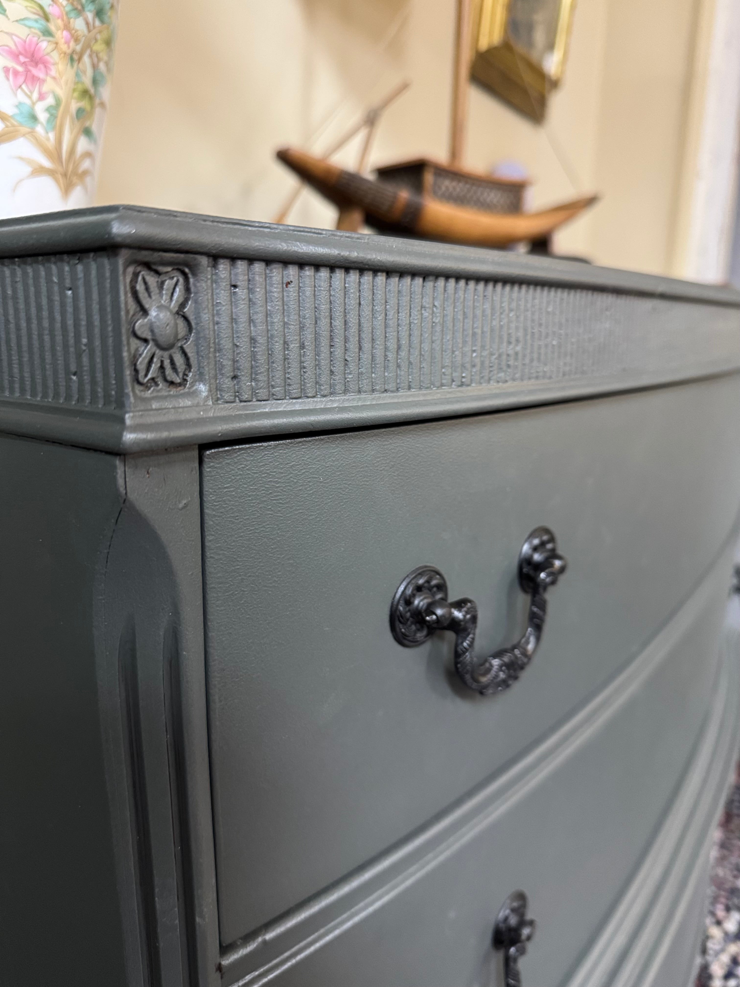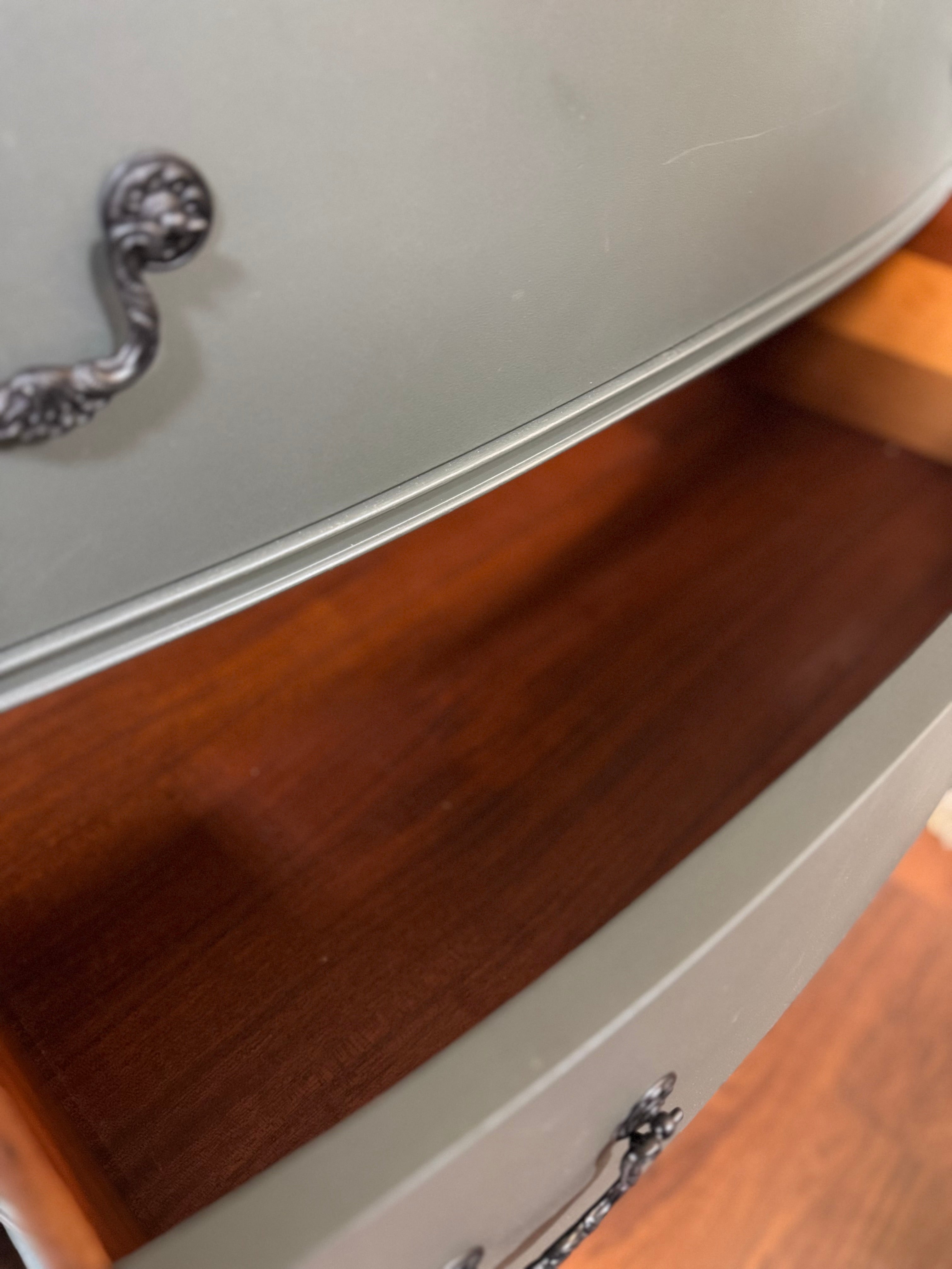 This vintage dresser is in great shape. It’s been painted with Fusion Wellington. The drawer pulls have all been painted in farmhouse black and the interior drawers have all been refreshed with wise owl salve. All of the drawers work well. Deliver available for an additional cost. This piece is currently available at Sentimental Journey in Johnson City TN.